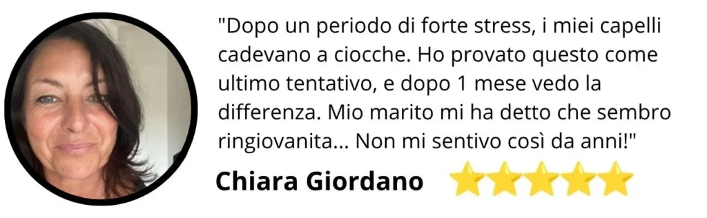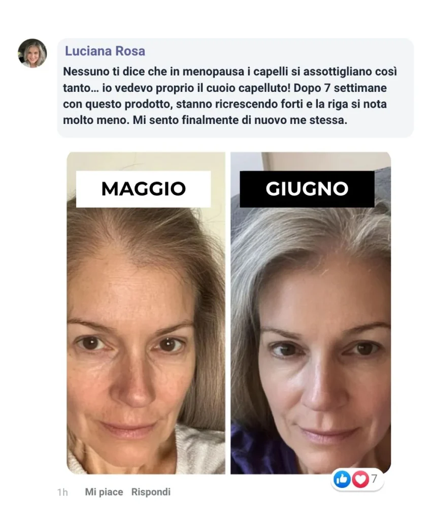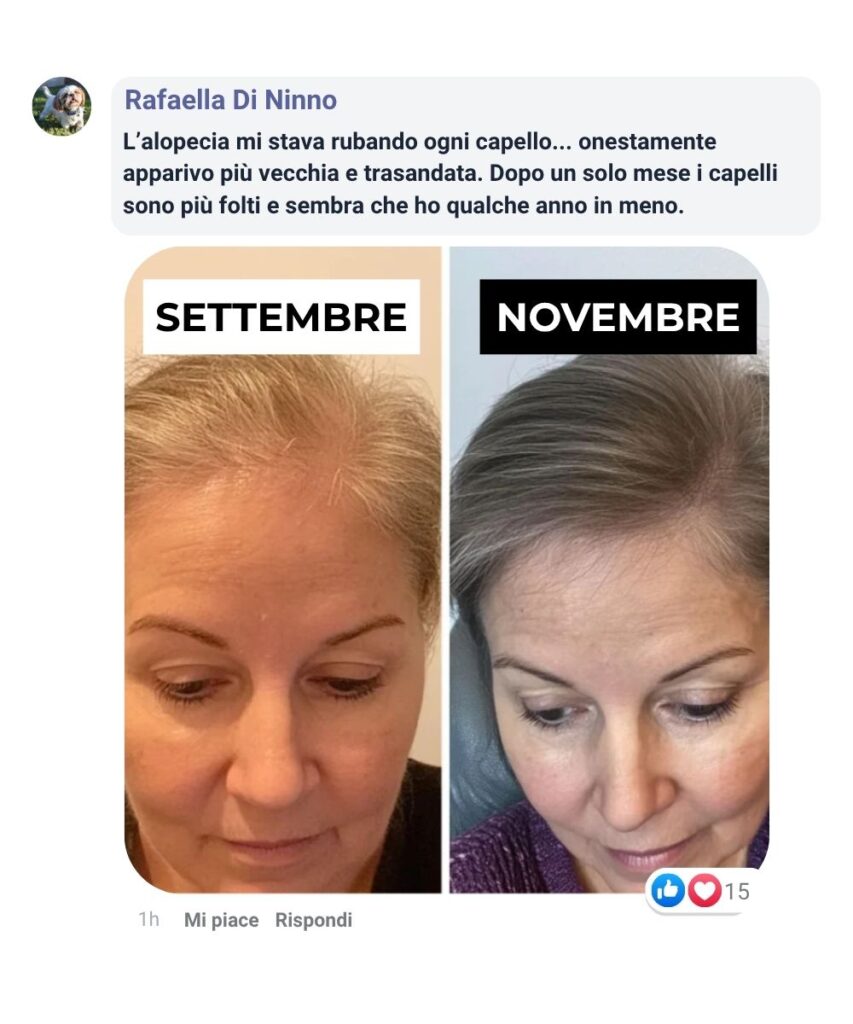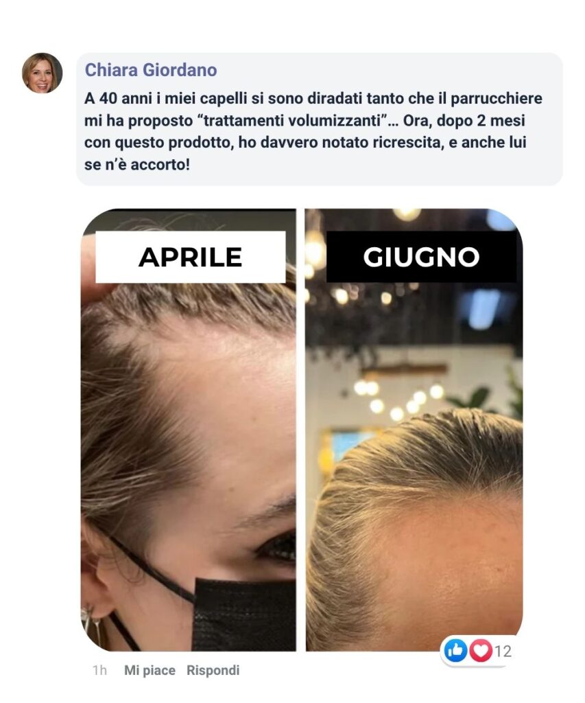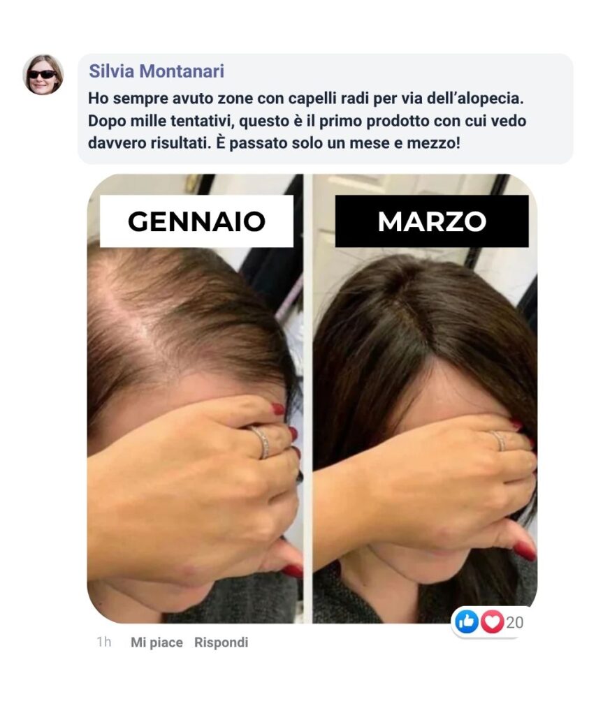 “Dopo il mio terzo bambino, la perdita di capelli è stata peggiore che mai – nelle foto si poteva letteralmente vedere attraverso la zona della mia corona. Uso questo prodotto da 9 settimane e la differenza è incredibile. Mio marito continua a notare tutti i nuovi capelli spuntati che crescono a ciuffetti. Le foto del prima e dopo che ho scattato sono impressionanti. È un sollievo enorme non vedere più ciocche di capelli sul cuscino!”